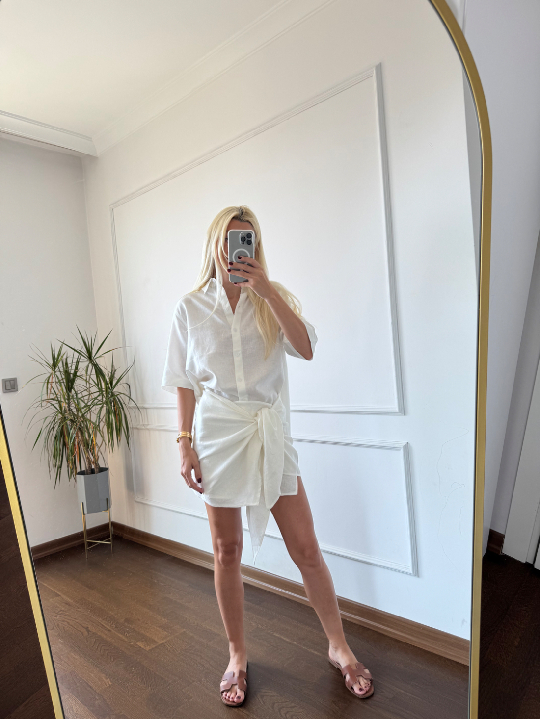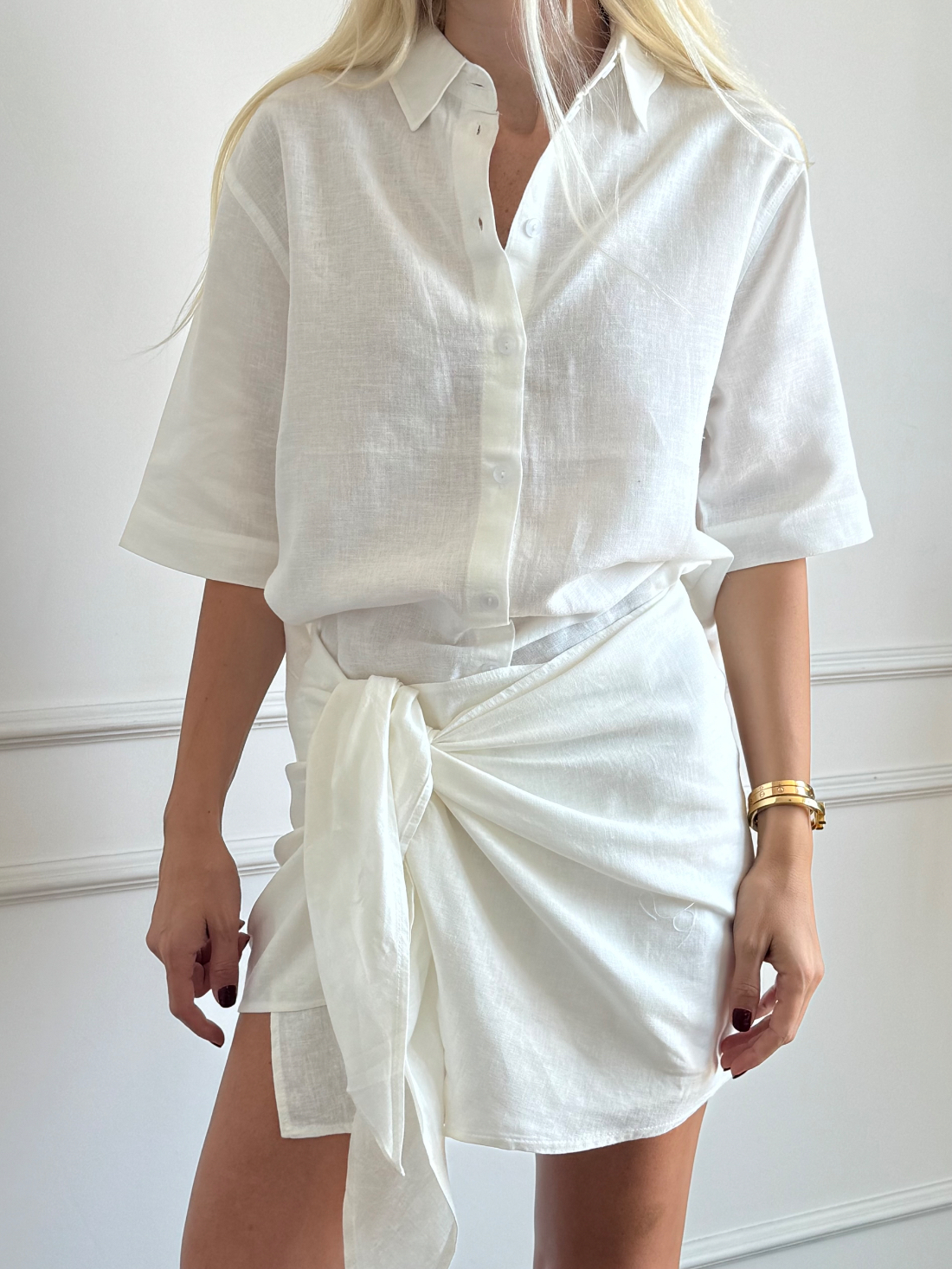 Beyaz Bağlama Detaylı Keten Gömlek Etek Takım
