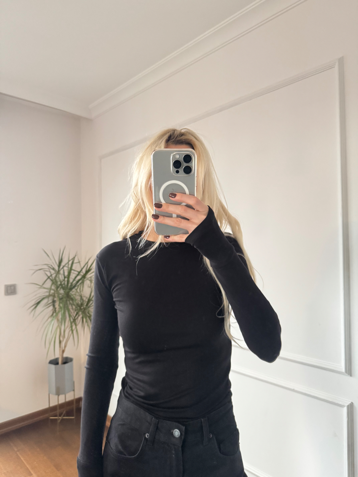 Bisiklet Yaka Parmak Geçmeli Siyah Örme Bluz