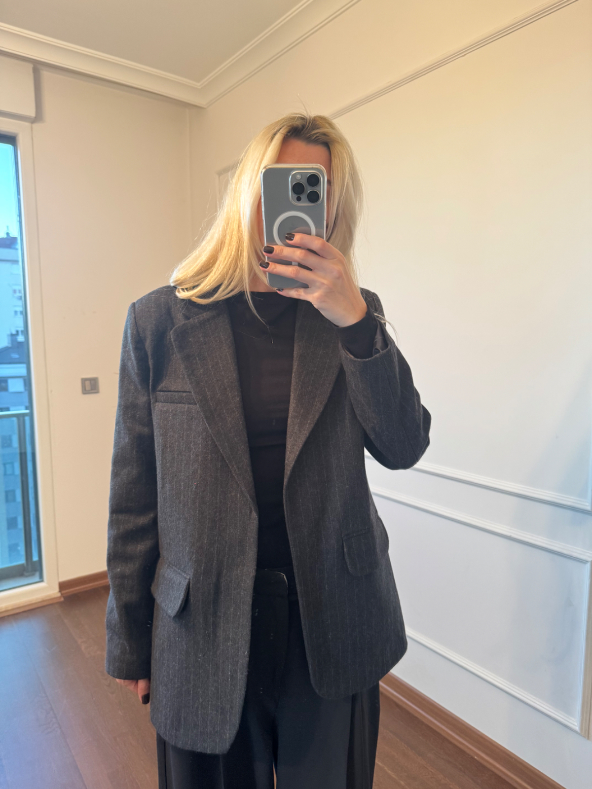 Kemerli Çizgili Antrasit Kaşe Ceket