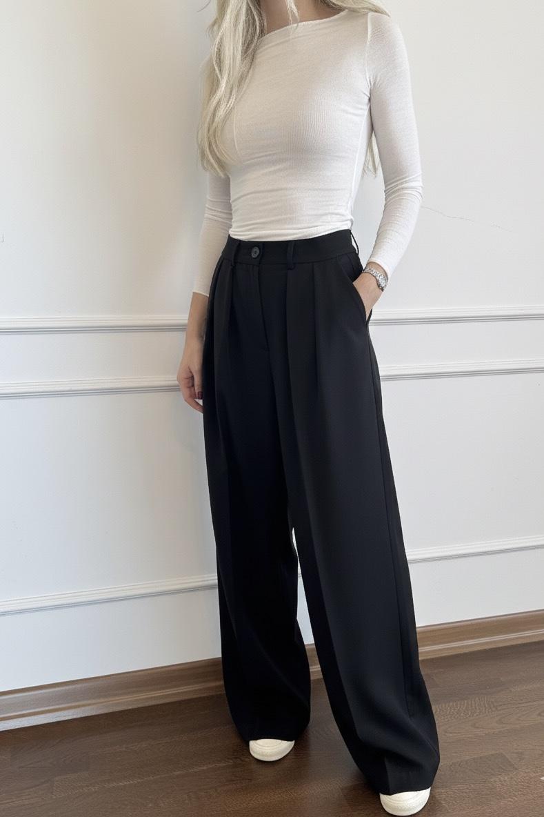Pileli Kemerli Siyah Palazzo Pantolon